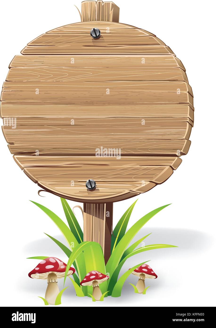 Download a wooden sign hanging from the side of a fence with grass and mushroomsWooden Sign Board Vector Illustration Stock Vector (Royalty Free